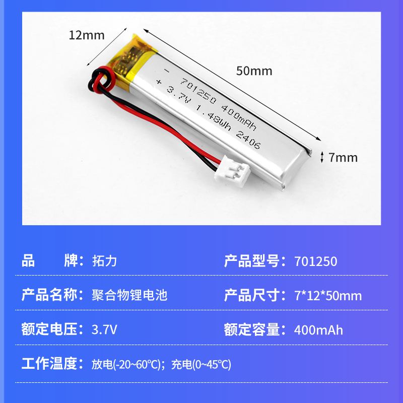 3.7V1800mah 103450 聚合物鋰電池東莞市拓力新能源科技有限公司成立于2017年,專業(yè)生產(chǎn)數(shù)碼電池、工業(yè)電池、動力電池,壁掛式儲能電池、鉛酸電池研發(fā)、太陽能模組、特種需求電池等電池相關(guān)產(chǎn)品