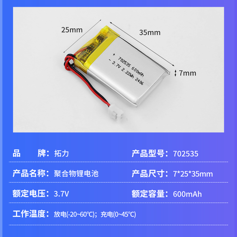 3.7V1800mah 103450 聚合物鋰電池東莞市拓力新能源科技有限公司成立于2017年,專業生產數碼電池、工業電池、動力電池,壁掛式儲能電池、鉛酸電池研發、太陽能模組、特種需求電池等電池相關產品