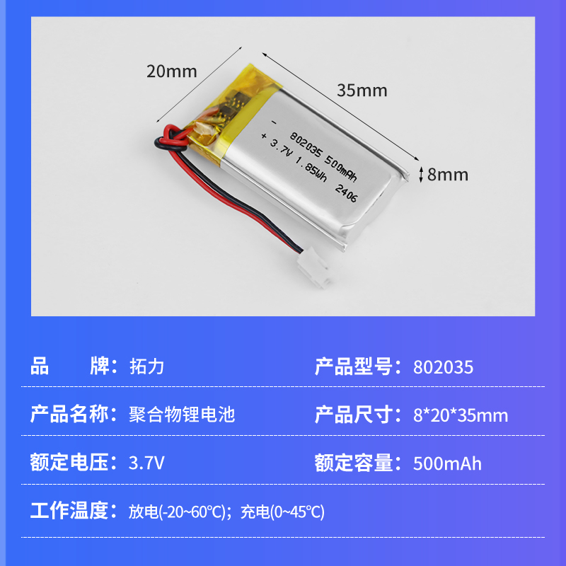 3.7V1800mah 103450 聚合物鋰電池東莞市拓力新能源科技有限公司成立于2017年,專業生產數碼電池、工業電池、動力電池,壁掛式儲能電池、鉛酸電池研發、太陽能模組、特種需求電池等電池相關產品